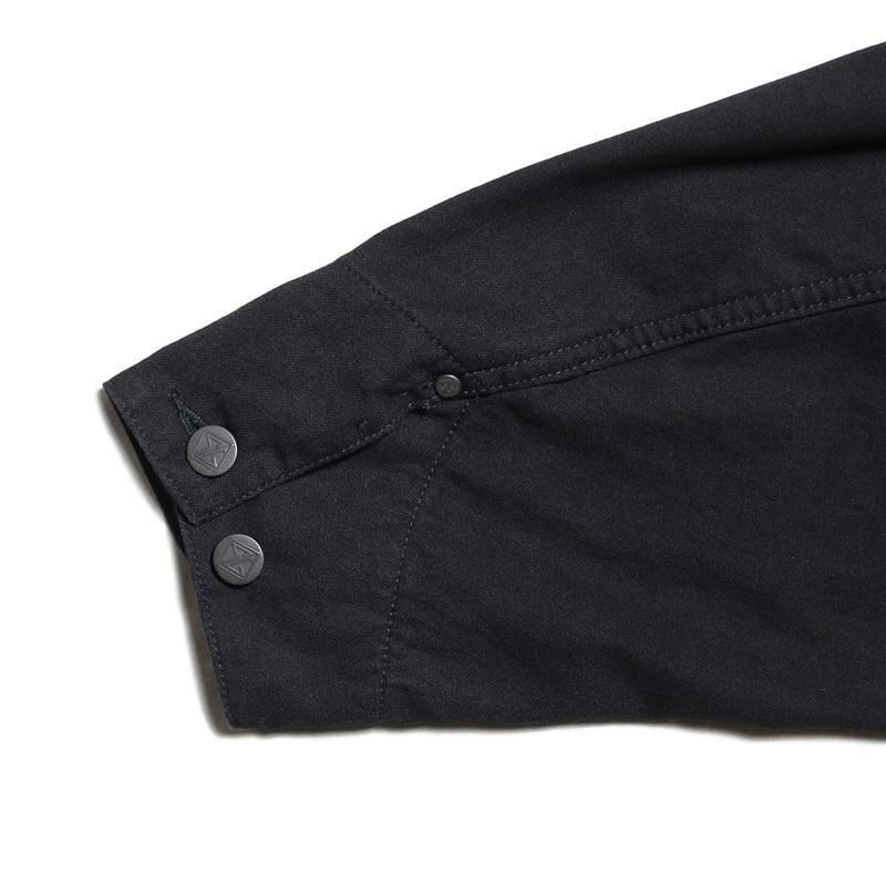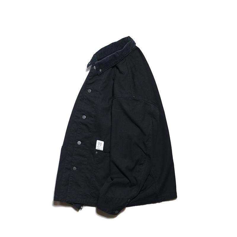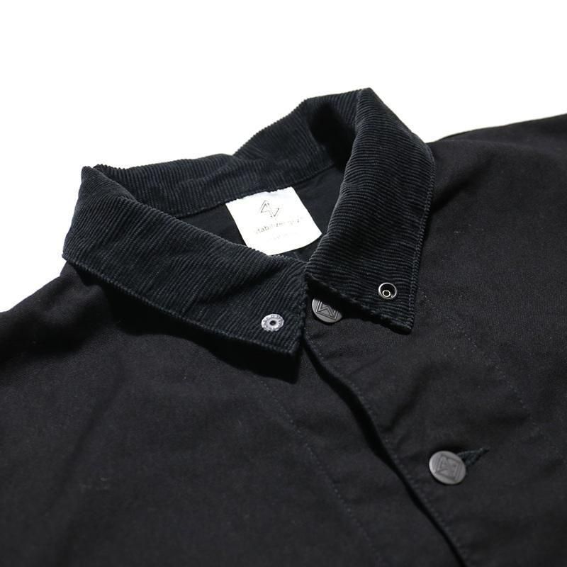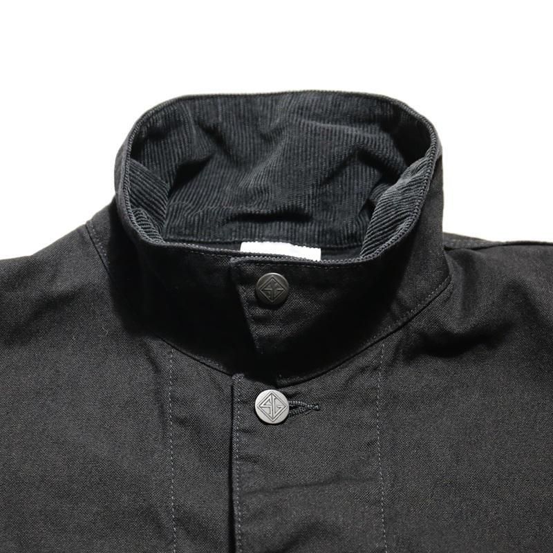 そのコットン・キャンバス生地に合わせ、一般的なカバーオールに見られる本体と衿が異なる色味の配色ではなく、コーデュロイの衿は同色としています。